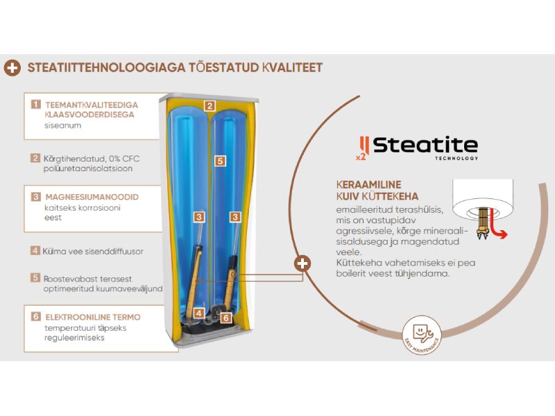Kuiv keraamiline küttekeha hülsis (Steatite): küttekeha ei ole otse vees, mis teeb lahenduse katlakivi suhtes vastupidavamaks ja hoolduse lihtsamaks (küttekeha vahetus ei eelda paagi tühjendamist).