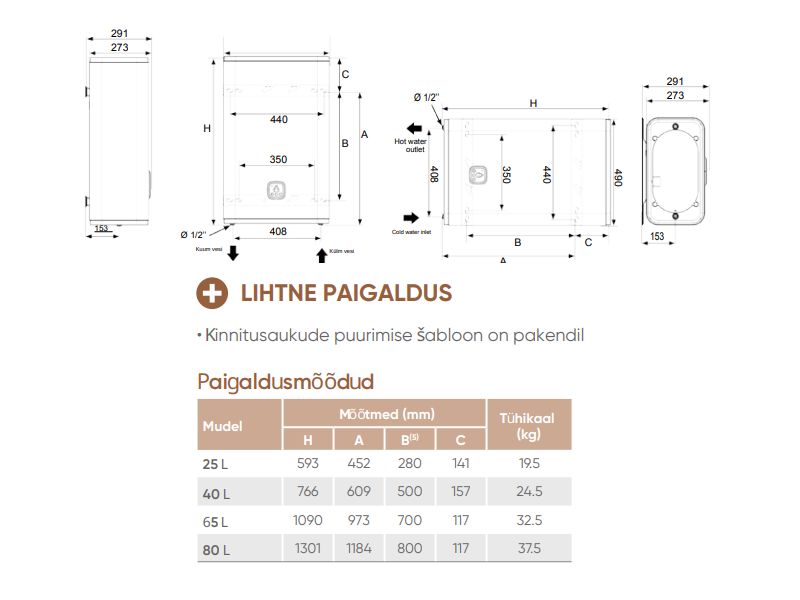 Veeühendused: Ø 1/2″.