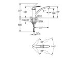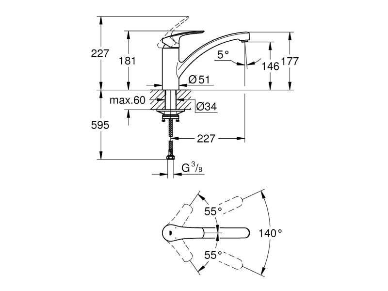 Mõõdud (mõõtjoonis): kogukõrgus 227 mm, tila ulatus 227 mm, tila kõrgus tööpinnast 177 mm, paigaldusava Ø34 mm, ühendus G 3/8″.