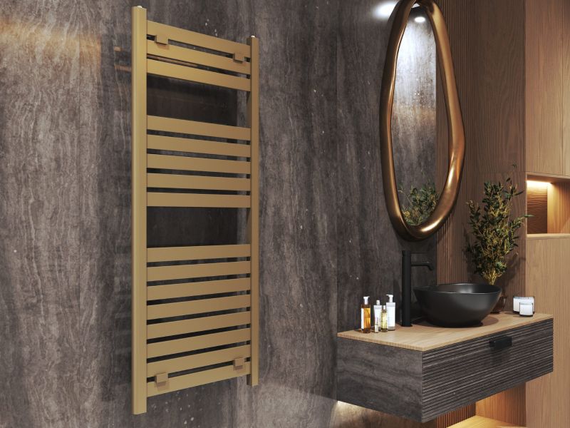 Arctic-seeria 50 × 120 cm on stiilne käterätikuivati, mis sobib hästi väiksemasse vannituppa. Kuldne viimistlus ja minimalistlik redelilaadne disain annavad ruumile modernse ilme, pakkudes samal ajal tõhusat soojust ja praktilist kohta rätikute kuivatamiseks.