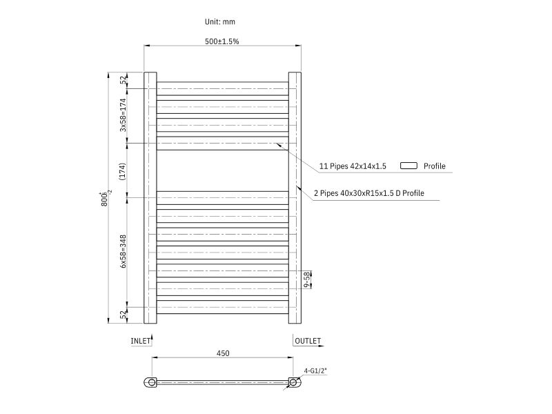 Mõõdud: kõrgus 800 mm, laius 500 mm.