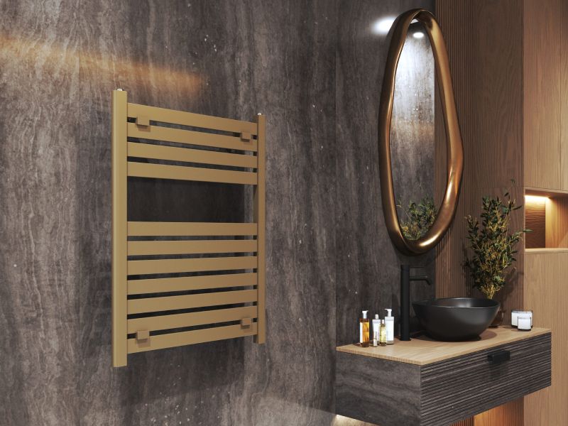 Arctic-seeria 60 × 80 cm on stiilne käterätikuivati, mis sobib hästi väiksemasse vannituppa. Kuldne viimistlus ja minimalistlik redelilaadne disain annavad ruumile modernse ilme, pakkudes samal ajal tõhusat soojust ja praktilist kohta rätikute kuivatamiseks.