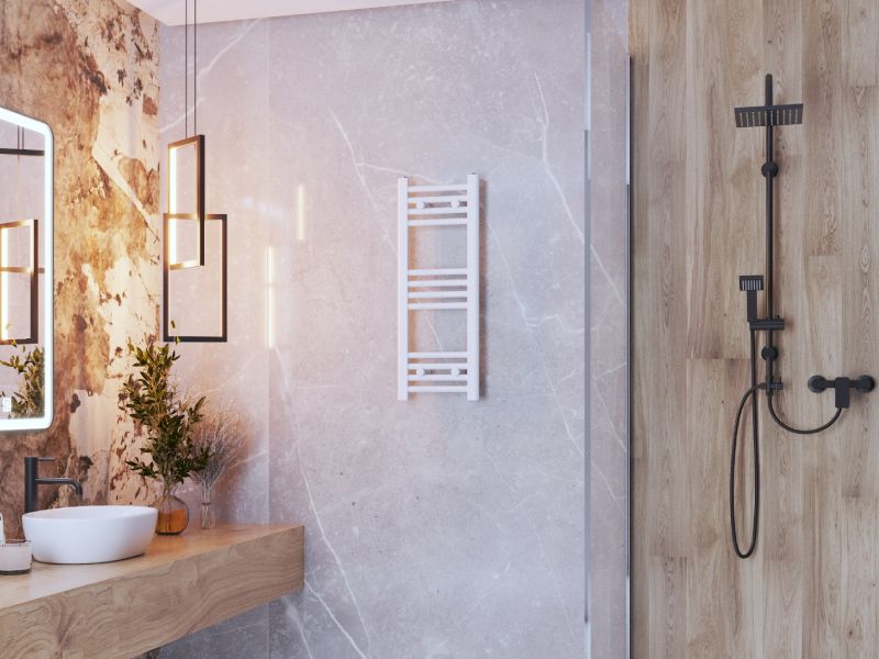 BASIC-seeria 30 × 80 cm on kompaktne ja stiilne käterätikuivati, mis sobib hästi väiksemasse vannituppa. Valge viimistlus ja minimalistlik redelilaadne disain annavad ruumile modernse ilme, pakkudes samal ajal tõhusat soojust ja praktilist kohta rätikute kuivatamiseks.