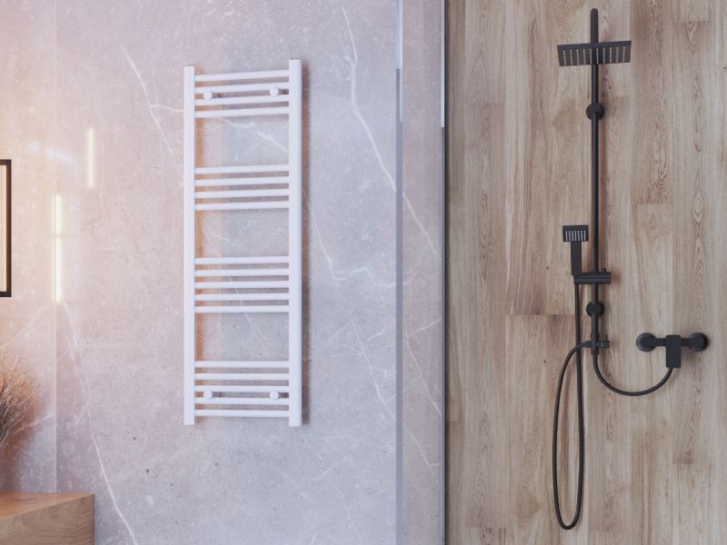 BASIC-seeria 40 × 120 cm on kompaktne ja stiilne käterätikuivati, mis sobib hästi väiksemasse vannituppa. Valge viimistlus ja minimalistlik redelilaadne disain annavad ruumile modernse ilme, pakkudes samal ajal tõhusat soojust ja praktilist kohta rätikute kuivatamiseks.