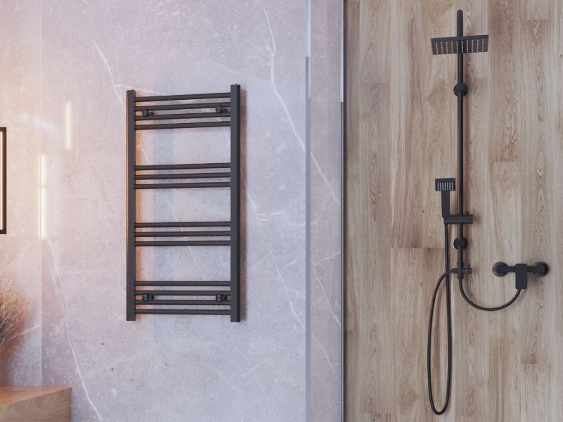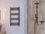 BASIC-seeria 50 × 100 cm on kompaktne ja stiilne käterätikuivati, mis sobib hästi väiksemasse vannituppa. Must viimistlus ja minimalistlik redelilaadne disain annavad ruumile modernse ilme, pakkudes samal ajal tõhusat soojust ja praktilist kohta rätikute kuivatamiseks.