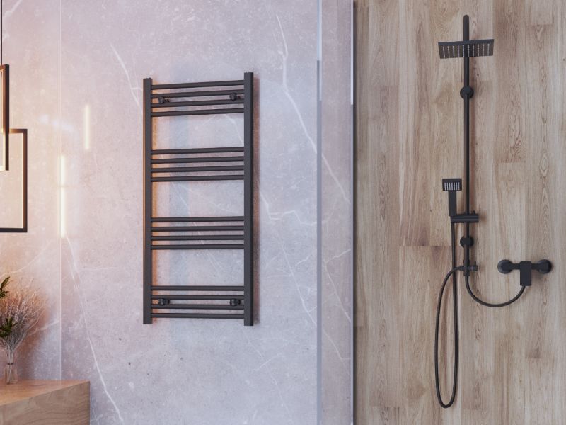 BASIC-seeria 50 × 110 cm on kompaktne ja stiilne käterätikuivati, mis sobib hästi väiksemasse vannituppa. Must viimistlus ja minimalistlik redelilaadne disain annavad ruumile modernse ilme, pakkudes samal ajal tõhusat soojust ja praktilist kohta rätikute kuivatamiseks.