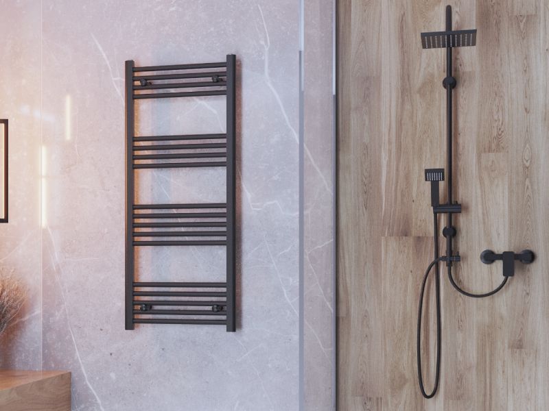 BASIC-seeria 50 × 120 cm on kompaktne ja stiilne käterätikuivati, mis sobib hästi väiksemasse vannituppa. Must viimistlus ja minimalistlik redelilaadne disain annavad ruumile modernse ilme, pakkudes samal ajal tõhusat soojust ja praktilist kohta rätikute kuivatamiseks.