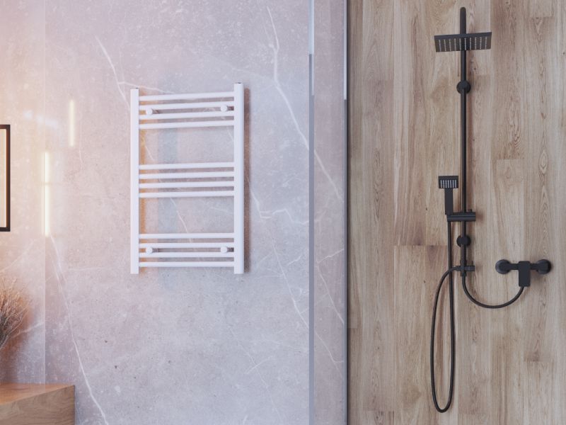 BASIC-seeria 50 × 80 cm on kompaktne ja stiilne käterätikuivati, mis sobib hästi väiksemasse vannituppa. Valge viimistlus ja minimalistlik redelilaadne disain annavad ruumile modernse ilme, pakkudes samal ajal tõhusat soojust ja praktilist kohta rätikute kuivatamiseks.