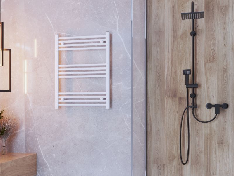 BASIC-seeria 60 × 80 cm on kompaktne ja stiilne käterätikuivati, mis sobib hästi väiksemasse vannituppa. Valge viimistlus ja minimalistlik redelilaadne disain annavad ruumile modernse ilme, pakkudes samal ajal tõhusat soojust ja praktilist kohta rätikute kuivatamiseks.
