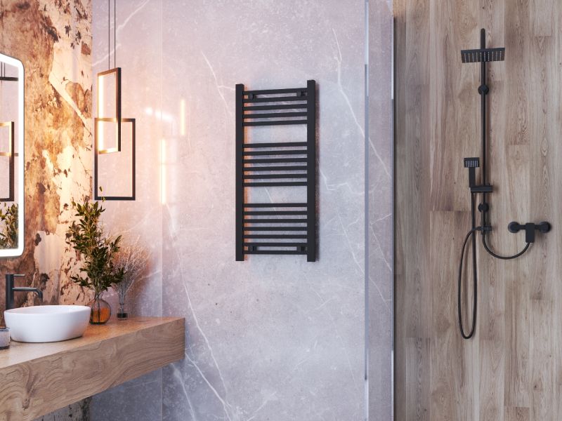 Proper-seeria 45 × 100 cm on kompaktne ja stiilne käterätikuivati, mis sobib hästi väiksemasse vannituppa. Must viimistlus ja minimalistlik redelilaadne disain annavad ruumile modernse ilme, pakkudes samal ajal tõhusat soojust ja praktilist kohta rätikute kuivatamiseks.