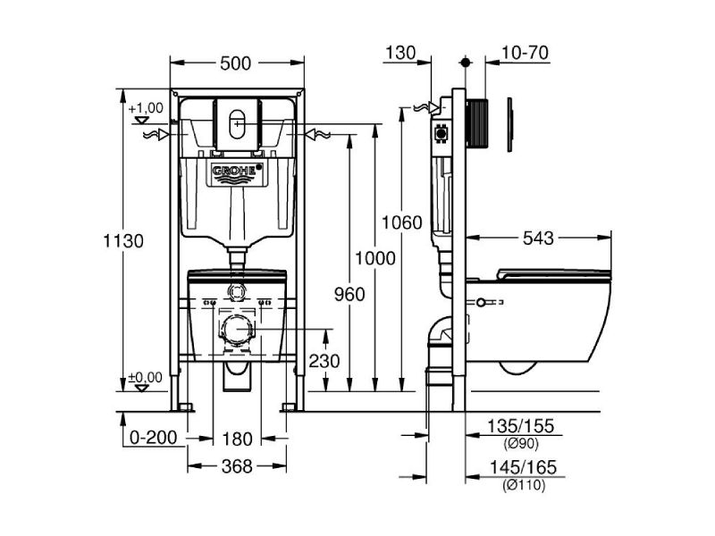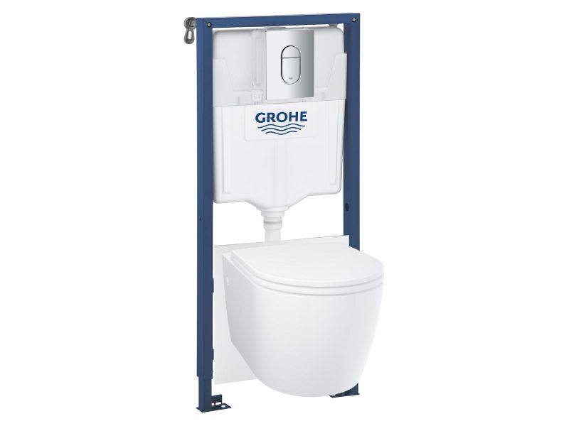 GROHE Rapid SL 5-in-1 WC-pakett 1,13 m (103849SH00) on valmis “kõik-ühes” komplekt seinapealse WC paigaldamiseks, kus raam, peidetud paak, keraamika ja loputusnupp on omavahel kokku sobitatud. Komplektis on Bau Ceramic rimless seinapott koos Soft Close istme/kaanega, Arena Cosmopolitan kroomitud loputusplaat, seinakinnitused ja mürasummutuskomplekt – ehk kõik põhi, mida paigalduseks tavaliselt vaja.