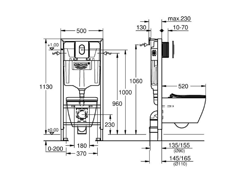 GROHE Solido 4-in-1 WC-komplekt 1,13 m (101046SH0H) sisaldab põhikomponente, mida vajad seinapealse WC lahenduse paigaldamiseks: Rapid SL paigalduselement, loputusnupp, rimless seinapott ning slim prill-laud. See on praktiline valik, kui soovid saada ühe tootenumbriga kokku sobiva komplekti, kus raam, nupp ja keraamika on omavahel kooskõlas.